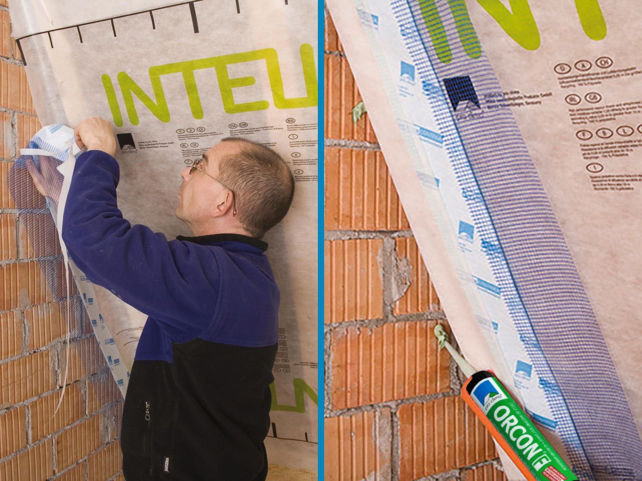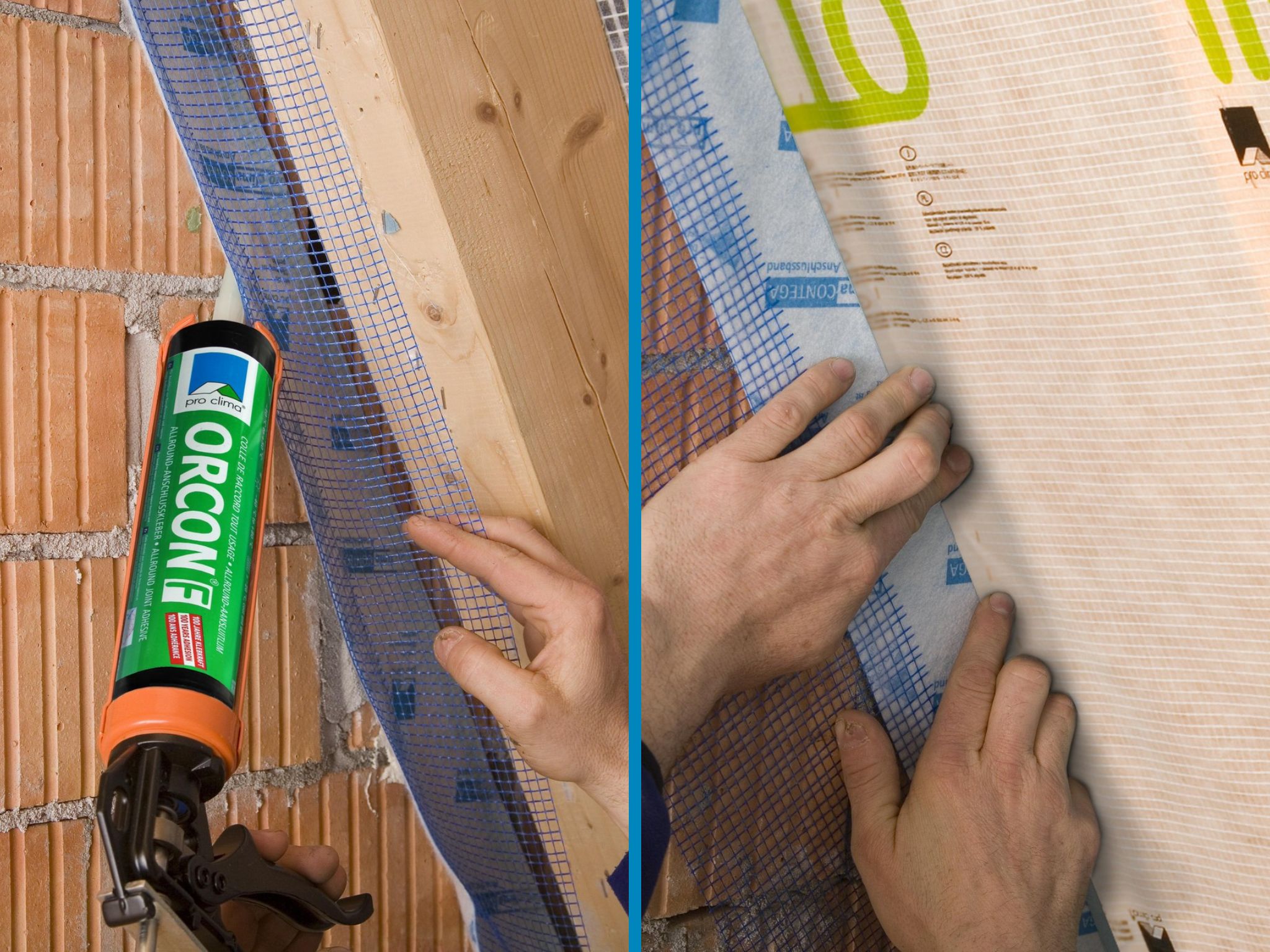Zagiąć taśmę i nałożyć punktowo ORCON F na ścianę (w odstępach ok. 10–20 cm), aby zabezpieczyć warstwę CONTEGA PV.